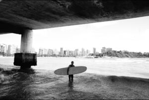 Conhecida por suas atividades de natação, canoagem e pesca, a baía de Vitória sempre pareceu um lugar improvável para o surf. Por ser uma enseada fechada e ampliada por aterros, as ondas raramente ganham força suficiente para serem surfadas. Ainda assim, em dias raros, quando as micro-ondas e as refrações se alinham de forma quase mágica, a baía revela seus segredos, você sabe, fluxos de água que dançam com o improvável.